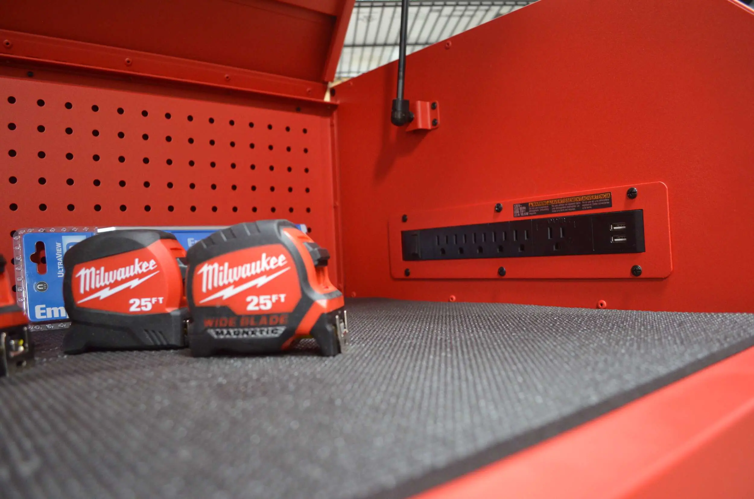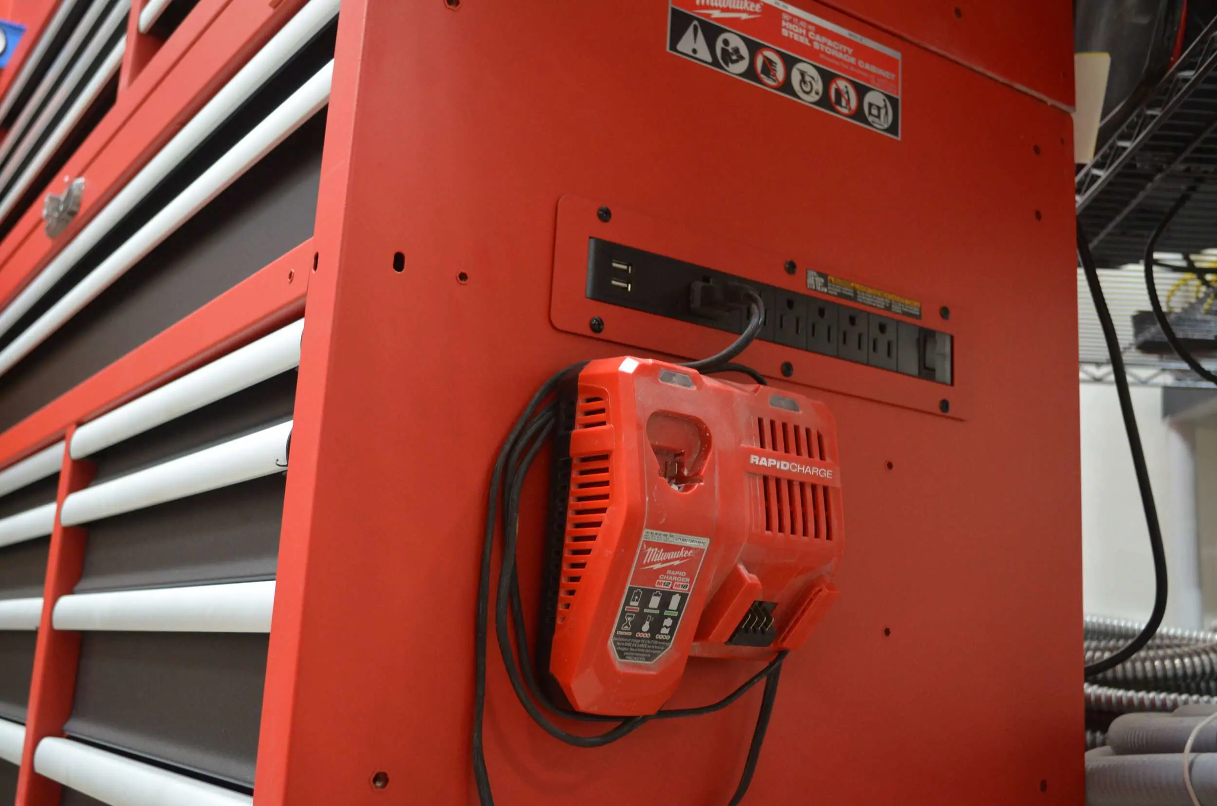 Some of the cool features that this cabinet comes with are two 120-v plug strips with USB ports so you can charge batteries, plug in lights, stereos or anything else you’re heart desires. One of these strips is located on the top shelf of the cabinet, the other is on the outside about knee-height from the ground. Also, in true Milwaukee fashion, there are spots near the outer strip to hang your Milwaukee battery chargers from so they can stay plugged in and always ready to charge batteries from.