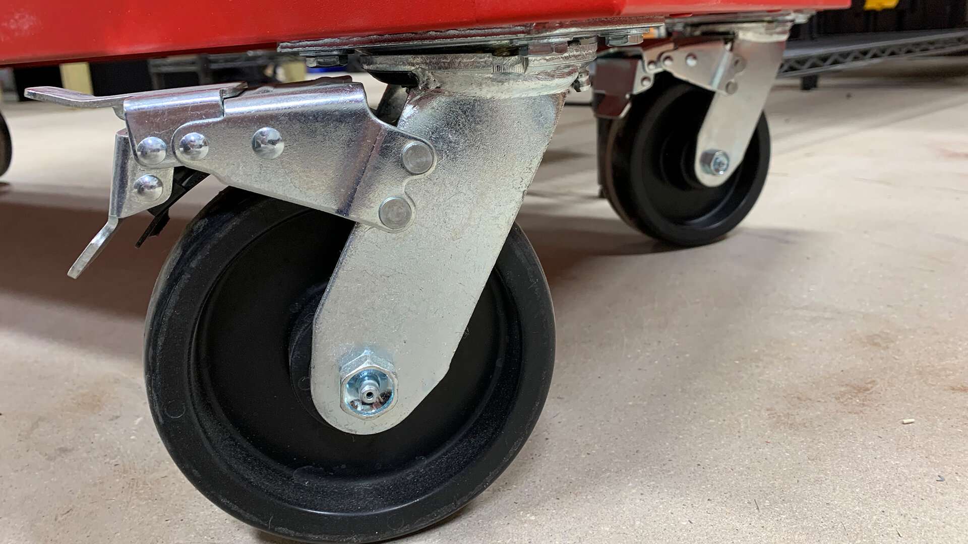 Both chests (upper and lower) come with rubbery mats that line each one of the drawers. The drawers have soft-close ball-bearing drawer slides on them so if you try to slam the drawers shut they stop and ease shut on their own. The whole cabinet sits on 6-inch industrial casters which is necessary considering this thing is roughly 700-lbs! The caster design is outstanding because you push down to lock them, and push down again to unlock them, rather than having to stick your toes under and pull up to unlock. This is one of my favorite innovations that are coming on Milwaukee’s chests and cabinets these days.